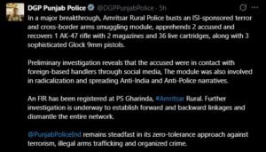 ਪੰਜਾਬ ਵਿੱਚ ਇੱਕ ISI-ਸਮਰਥਿਤ ਅੱਤਵਾਦੀ ਮਾਡਿਊਲ ਦਾ ਪਰਦਾਫਾਸ਼ ਕੀਤਾ ਗਿਆ ਹੈ। ਅੰਮ੍ਰਿਤਸਰ ਦਿਹਾਤੀ ਪੁਲਿਸ ਨੂੰ ਇੱਕ ਵੱਡੀ ਸਫਲਤਾ ਮਿਲੀ ਹੈ। ਉਨ੍ਹਾਂ ਨੇ ਪਾਕਿਸਤਾਨ ਦੀ ਖੁਫੀਆ ਏਜੰਸੀ, ਆਈਐਸਆਈ ਨਾਲ ਜੁੜੇ ਇੱਕ ਅੱਤਵਾਦੀ ਅਤੇ ਸਰਹੱਦ ਪਾਰ ਹਥਿਆਰਾਂ ਦੀ ਤਸਕਰੀ ਕਰਨ ਵਾਲੇ ਮਾਡਿਊਲ ਦਾ ਪਰਦਾਫਾਸ਼ ਕੀਤਾ ਹੈ। ਪੁਲਿਸ ਨੇ ਇਸ ਮਾਮਲੇ ਦੇ ਸਬੰਧ ਵਿੱਚ ਦੋ ਨੌਜਵਾਨਾਂ ਨੂੰ ਗ੍ਰਿਫਤਾਰ ਕੀਤਾ ਹੈ ਅਤੇ ਉਨ੍ਹਾਂ ਦੇ ਕਬਜ਼ੇ ਵਿੱਚੋਂ ਵੱਡੀ ਮਾਤਰਾ ਵਿੱਚ ਆਧੁਨਿਕ ਹਥਿਆਰ ਬਰਾਮਦ ਕੀਤੇ ਹਨ।